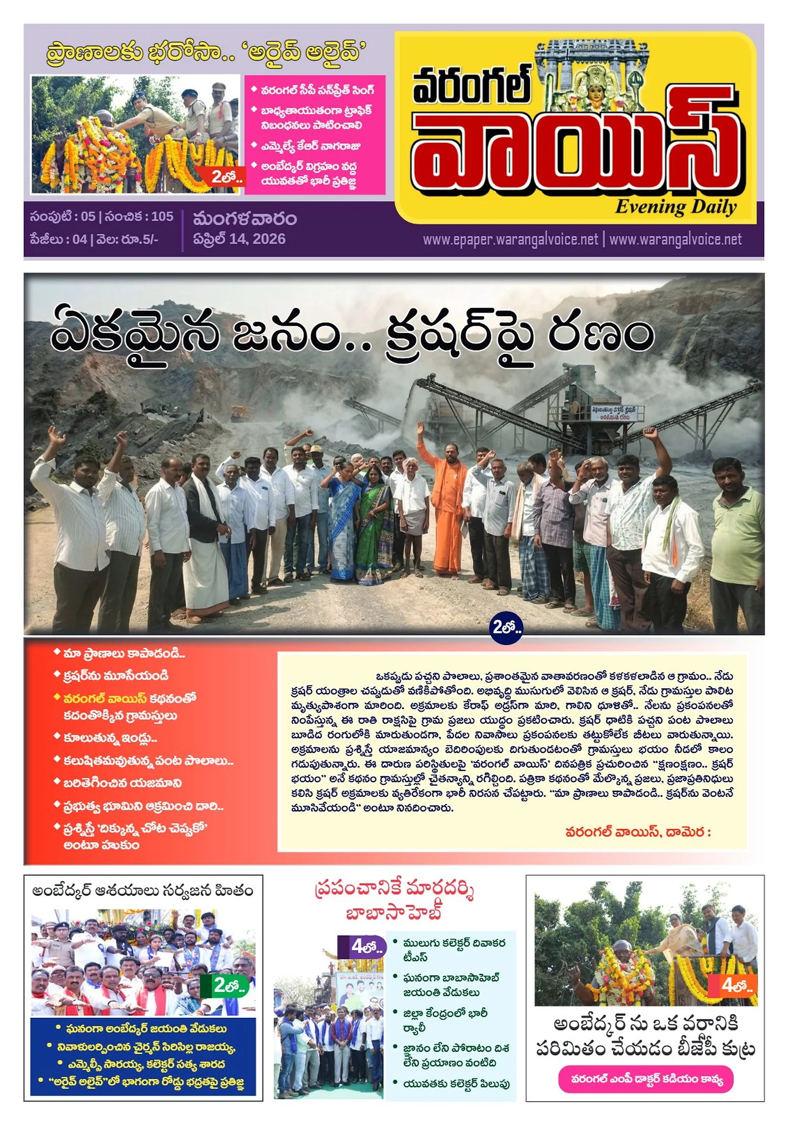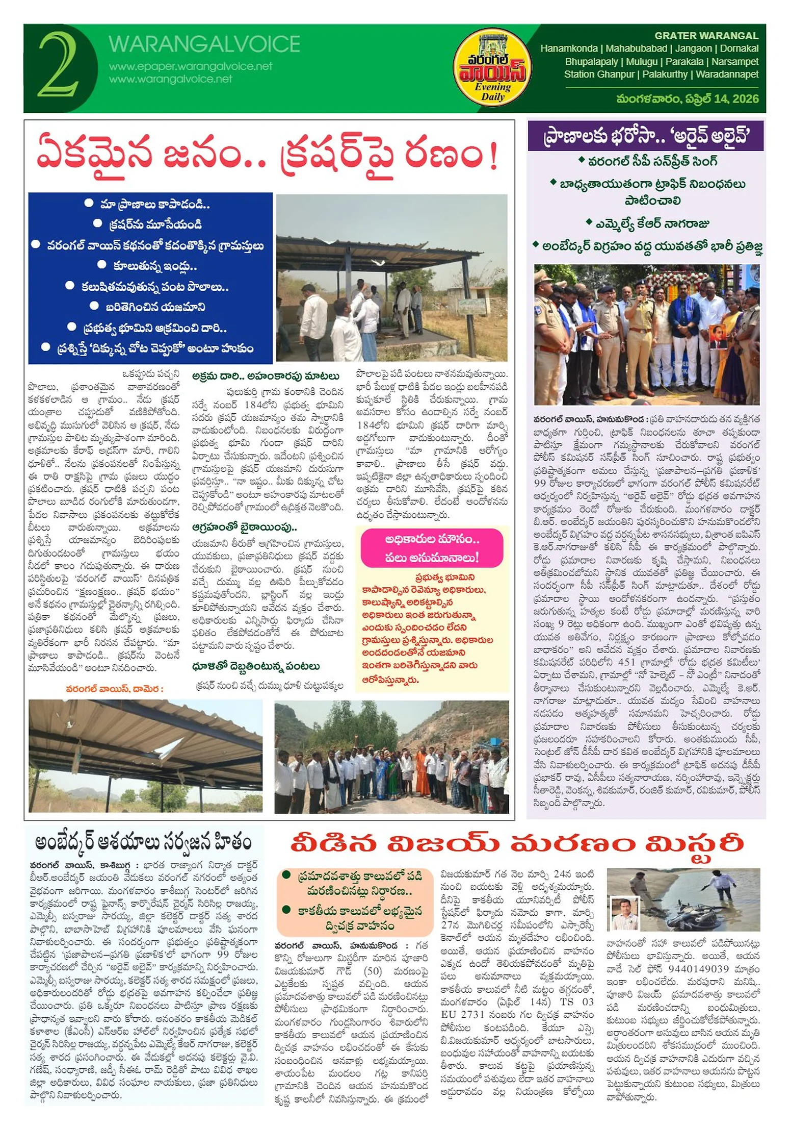 ఉద్యోగుల పెండింగ్ సమస్యల సాధనకై పోరుబాటగిర్నిబావిలో కంకులతో ‘మొక్కజొన్న ఇల్లు’నేటి ప్రపంచంలో కృత్రిమ మేధస్సు పాత్ర కీలకంఅంబేద్కర్ బడుగు బలహీన వర్గాల ఆరాధ్య దైవంఅంబేద్కర్ ఆశయ సాధనే లక్ష్యంఎలుకుర్తి హవేలీలో అంబేద్కర్ విగ్రహావిష్కరణమూడేళ్ల నిరాధరణకు ముగింపుఅలరించిన శ్రీహర్ష ద్విగుణిత అష్టావధానంఅంబేద్కర్ ఆశయ సాధనకు కృషి చేయాలిగర్వంగా చెప్పుకునేలా స్టేషన్ ఘనపూర్ అభివృద్ధి
