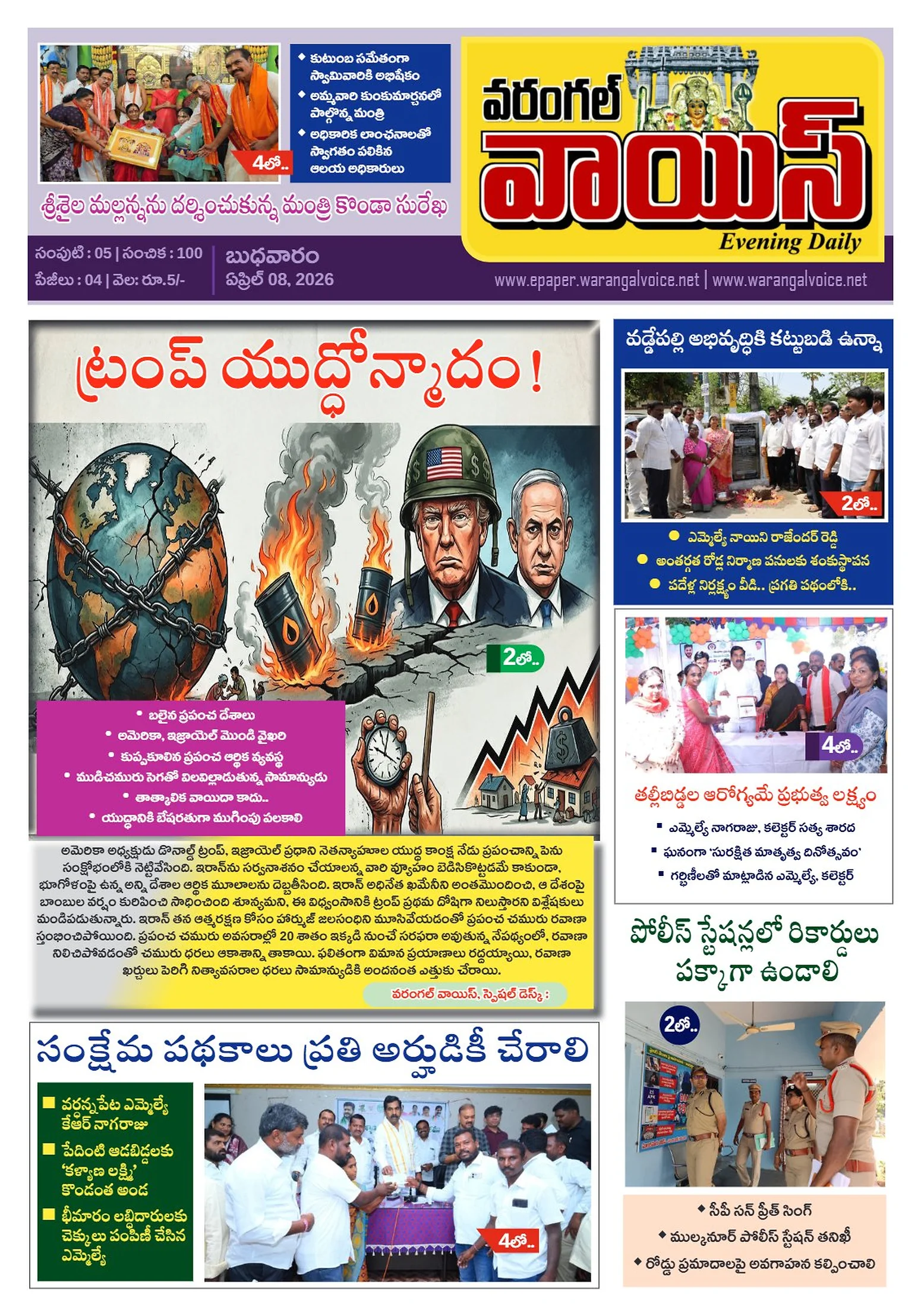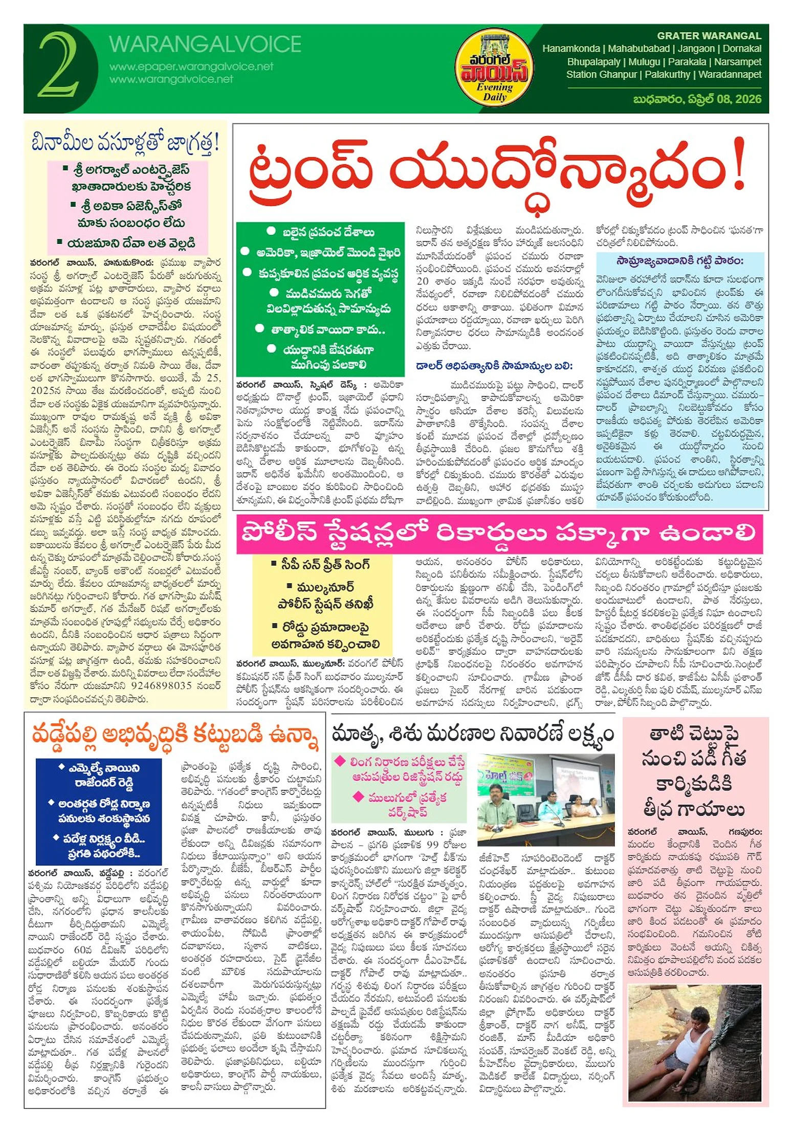 చిట్యాలలో ‘సీసీ కెమెరాల’ నిఘాభూమి లేని నిరుపేదలకు ఎకరం భూమి ఇవ్వాలినూతన గిడ్డంగికి ‘ఈవీఎం’ల తరలింపుపేద ప్రజల సంక్షేమమే ప్రభుత్వ లక్ష్యంఘోర రోడ్డు ప్రమాదంల్యాదల్ల రాజు హత్య కేసులో న్యాయం కోరుతూ కుమార్తె ధర్నాఉత్తమ సేవా అవార్డు అందుకున్న రాజేంద్రప్రసాద్!ఘనంగా హనుమాన్ మాల స్వాములకు భిక్షా కార్యక్రమంకే.యూలో జీవ విజ్ఞాన కేంద్రం త్వరలో ప్రారంభంఅవగాహనతోనే క్షయ నిర్మూలనం సాధ్యం